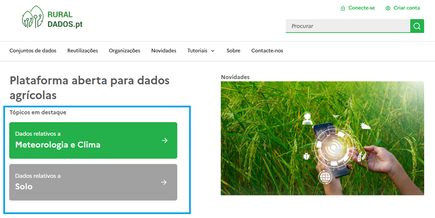A pesquisa exploratória pode ser realizada através dos temas destacados na página inicial. Os dados estão organizados por áreas-chave da atividade agrícola, incluindo: Meteorologia e Clima, Solo, Ordenamento do Território, Água, Mercados e Produtividade, Impacte Ambiental, Estatísticos, Socioeconómicos, Deteção Remota, Biodiversidade, Pragas, Governança, Tecnologia, Formação e Monitorização de Culturas.
