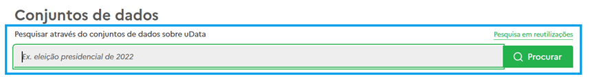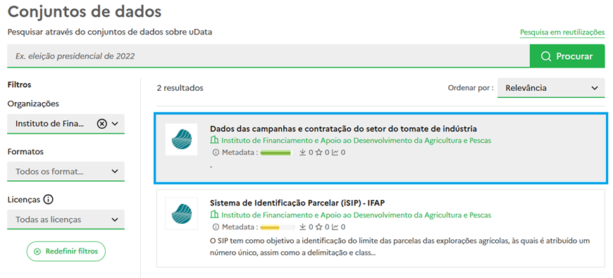 Os resultados da pesquisa podem ser ordenados de acordo com diferentes critérios: relevância, data de criação, última atualização, ou número de reutilizações associadas. Após a localização, para obter mais informação sobre os metadados de um conjunto de dados, basta clicar na área correspondente: